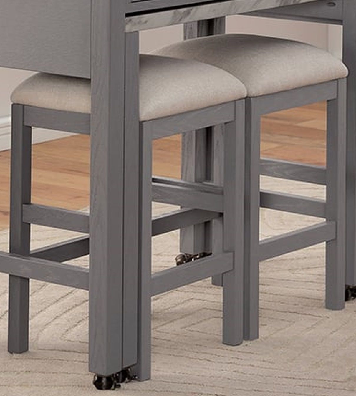 Description - A great kitchen island set up needs two things: enough space and storage to work with. This piece does just that. On top is white faux marble material that's both stylish and easy to keep clean. On the side is a large drawer for your tools and utensils. The matching stools come in the same light gray finish with upholstered fabric seats, And don't let the small stature fool you; the table top expands by virtue of the pullout sliding piece that rests on caster legs and tucks nicely underneath the table top. What you get is a kitchen that responds to your needs and transforms to whatever the occasion requires.Dimensions -Dining Table - 39"L X 20"W X 36"HNESTED TABLE - 35"L X 20"W X 30 1/2"HStools - 14"W X 14"D X 24"H (SEAT HT: 24", SEAT DP: 14")Listing includes - 5pc Counter Height Dining Set (Counter Height Table w Drawer And 4x Stools) Only.Features :-RusticWhite/Light Gray/BeigeLinen-like, Solid Wood, Wood Veneer, OthersFarmhouse DesignFaux Marble TopSlide-out Top ExtensionCasters on Table LegsFelt-lined Storage DrawerFabric Upholstered SeatFull-extension Ball-bearing Glides