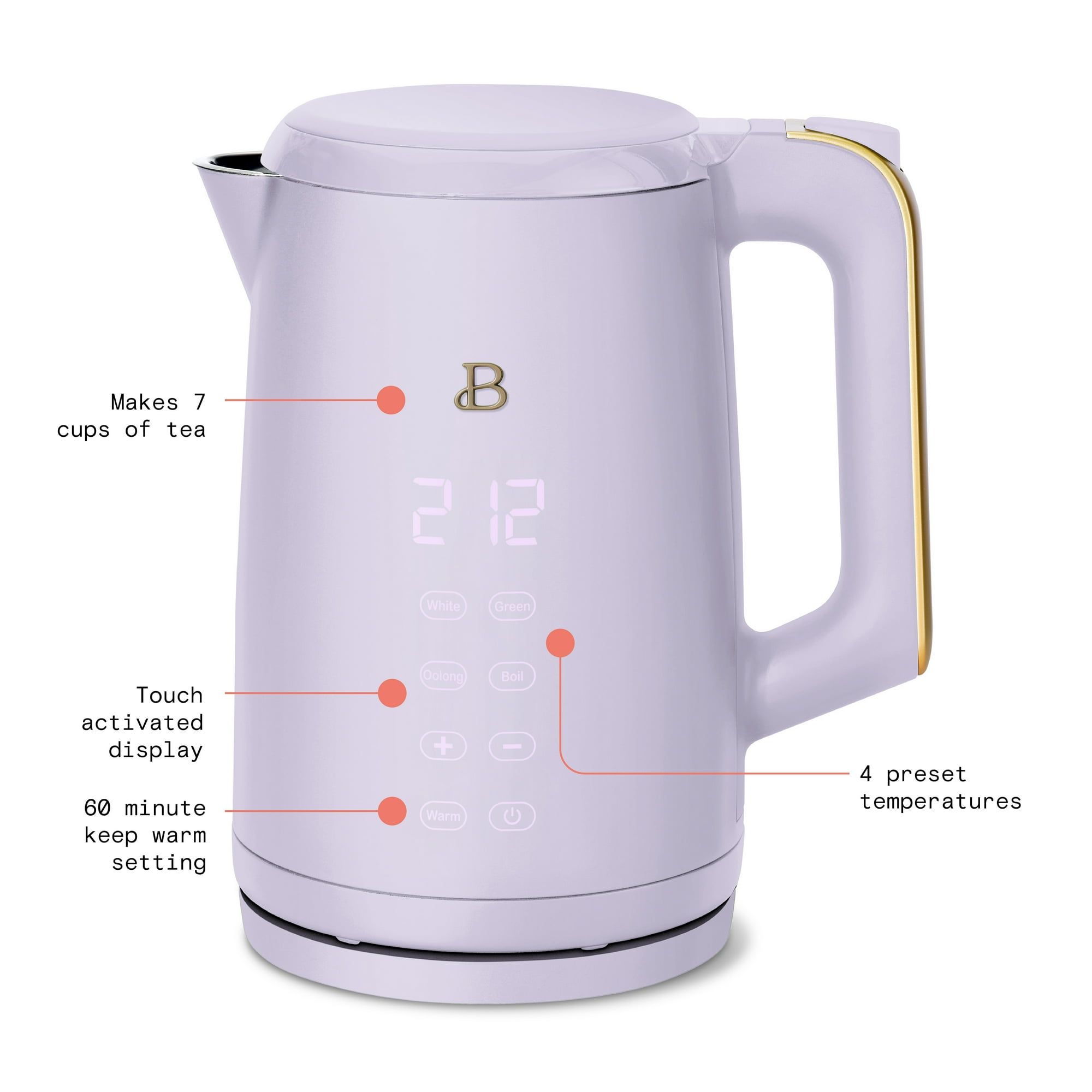 Tea that tastes just right. The Beautiful 1.7L Programmable Temperature Kettle with Touch-Activated Display allows you to boil 7 cups of water in under 7 minutes. 4 one-touch preset programs for white, green, oolong and black teas ensure every cup is brewed to perfection. Created by Drew Barrymore, Beautiful Kitchenware® combines elegant design and contemporary colors for high-performance appliances that look beautiful on your kitchen counter. Condition: new.