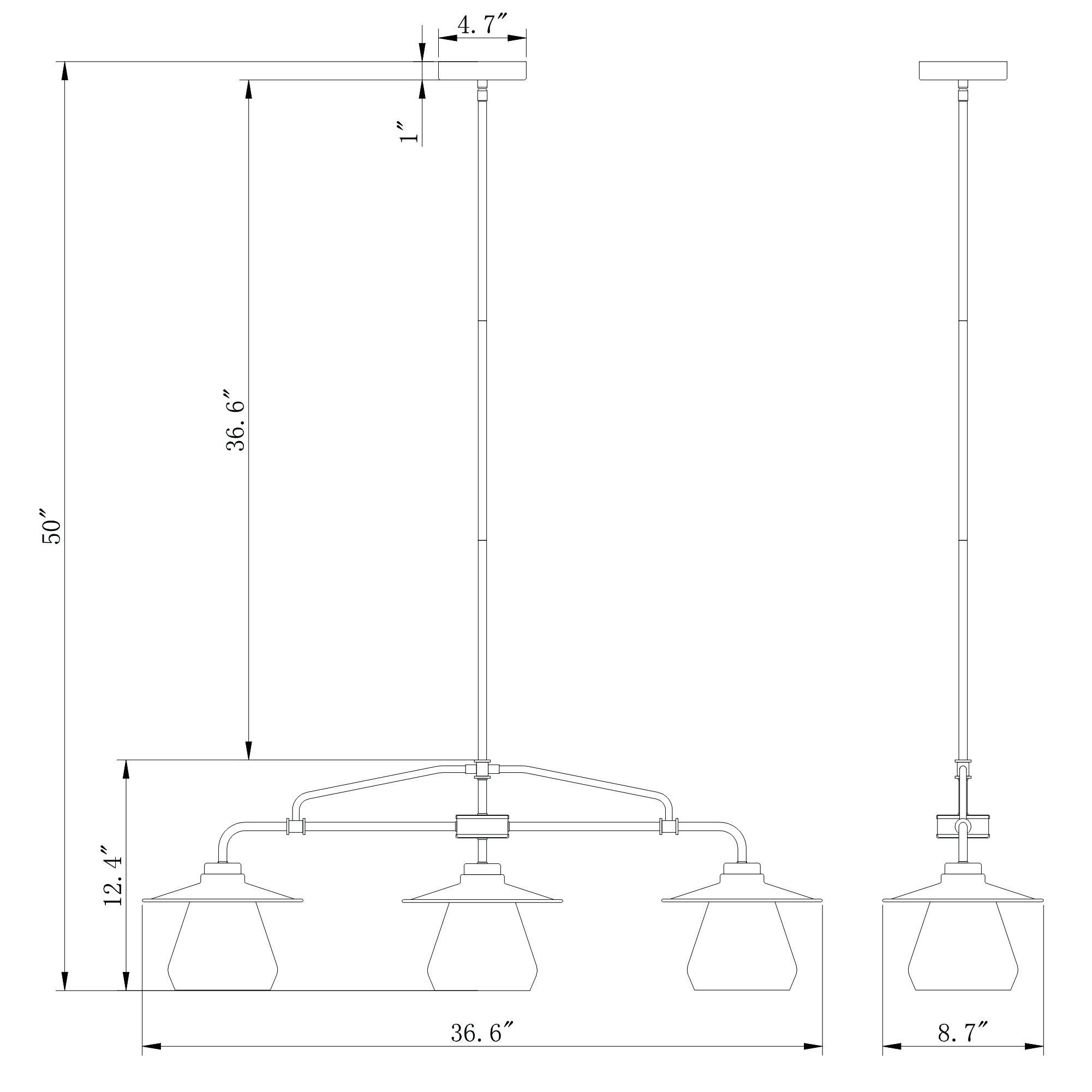 This full piped downrod metal chandelier with three hooded glass lamps is a fantastic addition to any home. Great character with the included Edison Style light bulbs. Perfect in an industrial designed space over a long counter or dining table.
