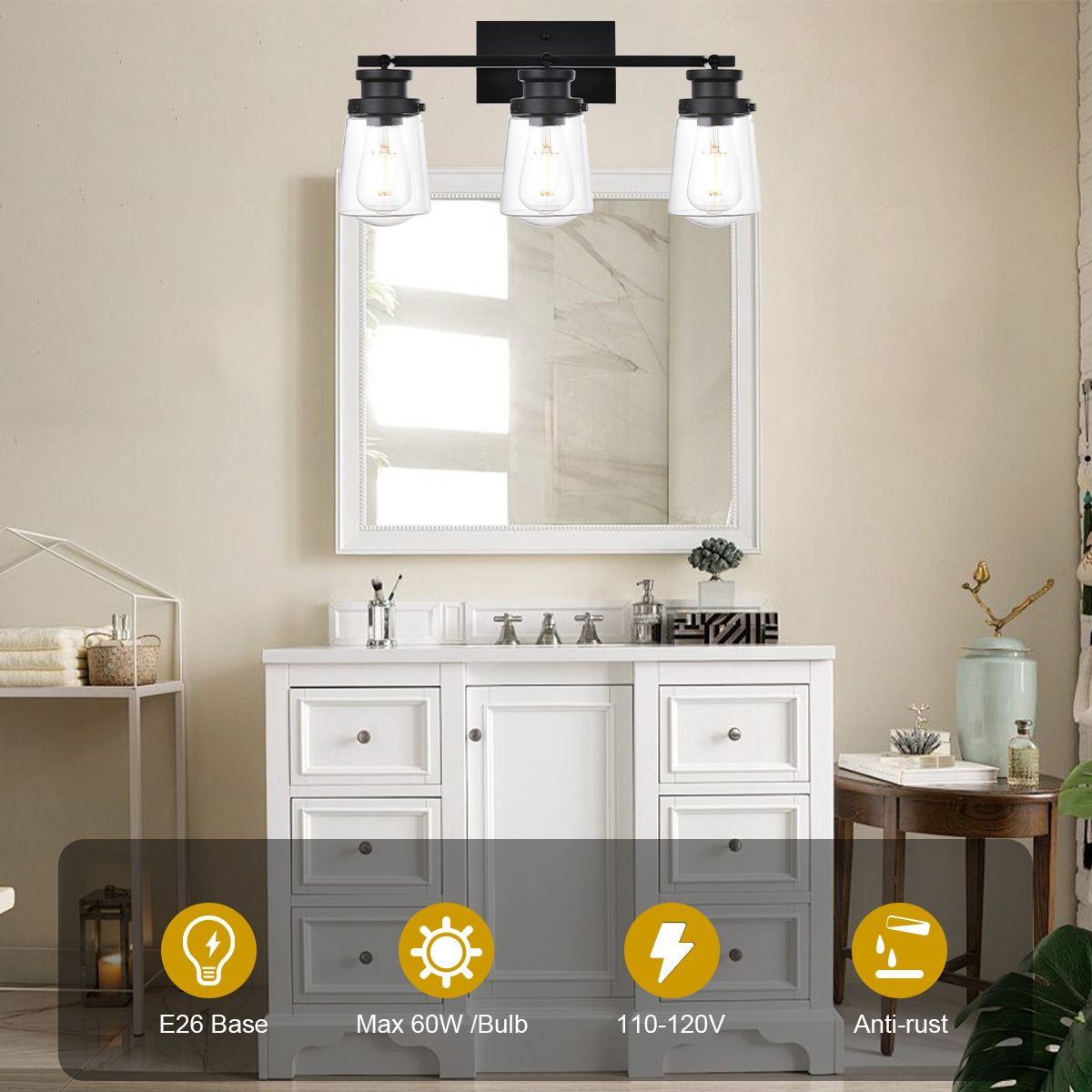 Unique Design:The bathroom light comes in a classic matte black and high quality clear glass shade, making this bathroom light modern, stylish and elegant on the mirror. This beautiful wall sconce vanity lamp is perfect for any home decor or office, adding elegance to your space